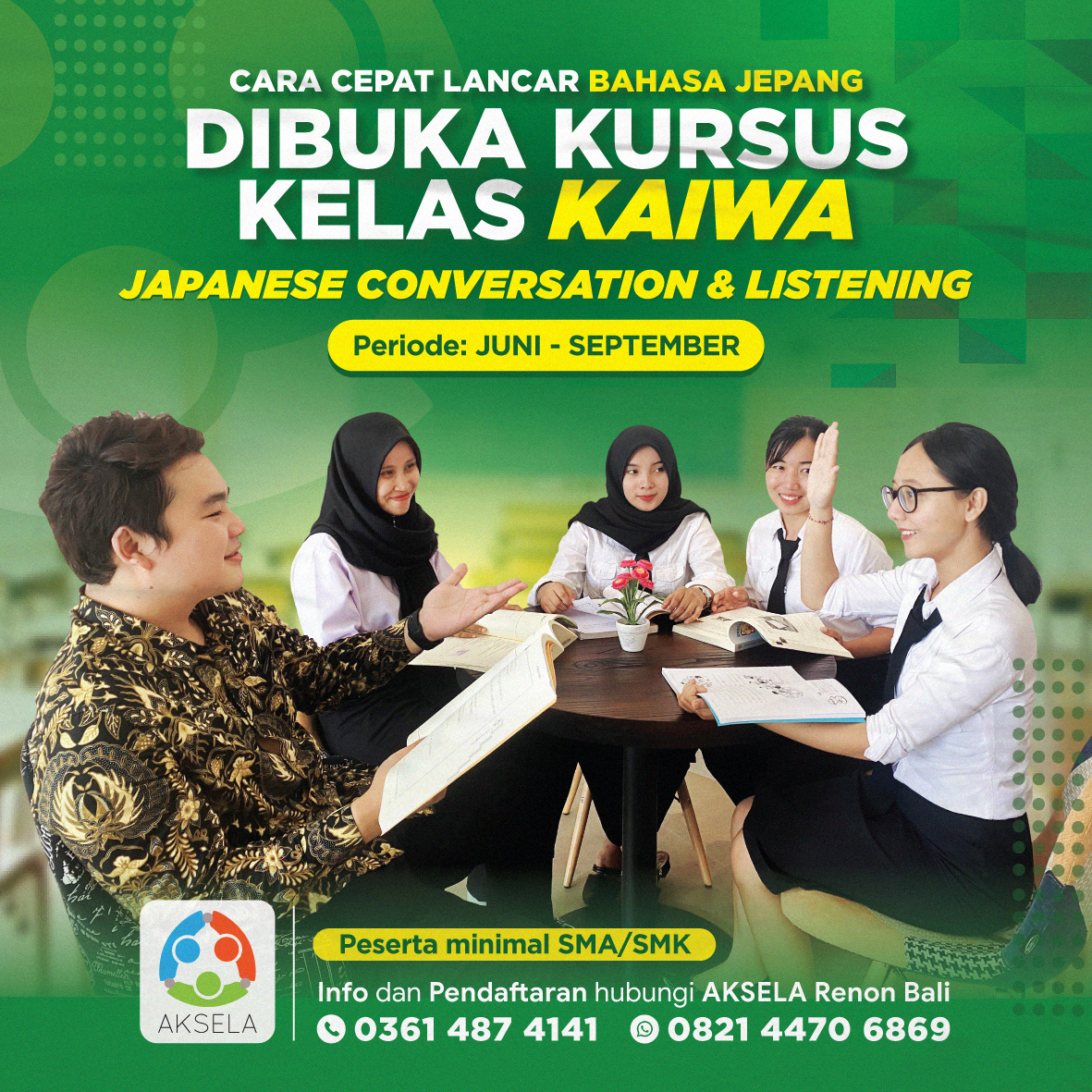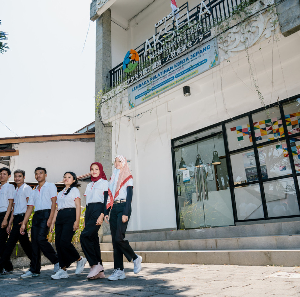 Saat pertama kali saya ingin berkerja kejepang saya mengikuti kelas ohayou (program bahasa jepang basic) dan kelas ganbaree (program belajar bahasa jepang level n5) di aksela. Dan saya sangat senang belajar diaksela, sistem pembelajarannya juga sangat seru, guru guru diaksela juga sangat baik. Dan ketika saya akan mengikuti interview saya dapat latihan untuk interview kerja. diaksela saya tidak hanya belajar bahasa jepang, saya juga belajar budaya jepang, dan juga saya mendapat pengalaman baru tinggal diasrama bersama teman”. banyak sekali hal baru tentang budaya jepang, yang saya dapatkan di aksela. terimakasih aksela, dan sekarang saya bekerja di miyazaki, Jepang.